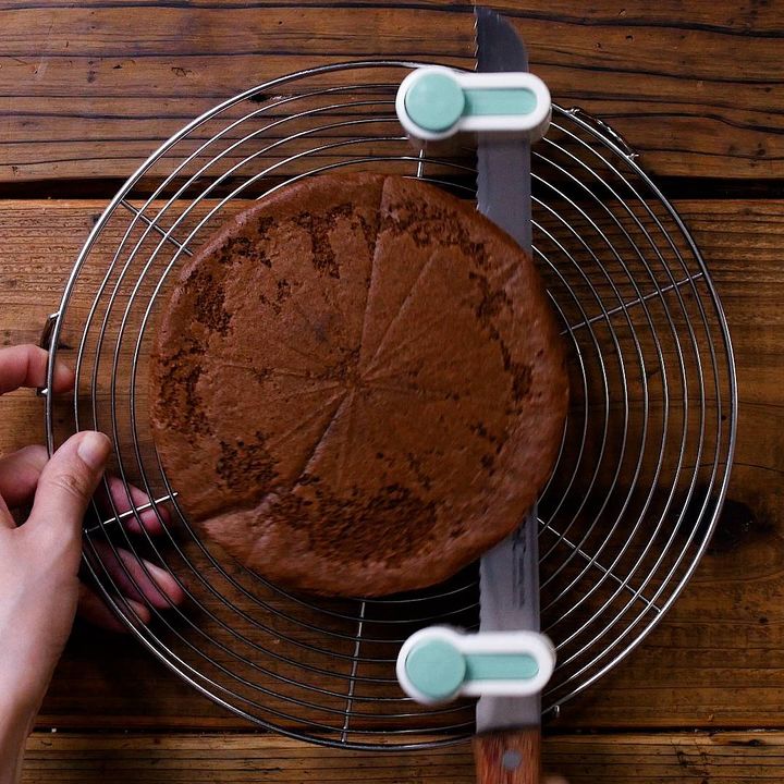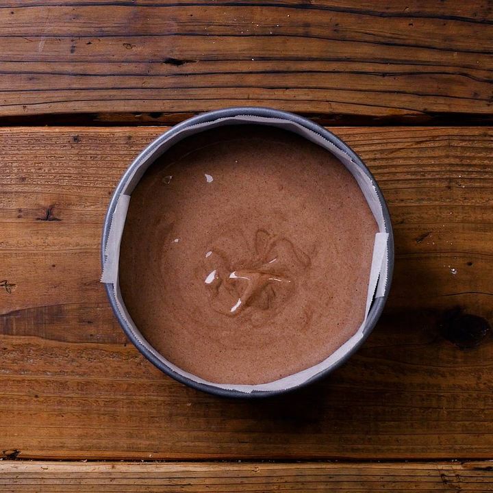 7: 型に生地を流し入れ、180℃のオーブンで20〜25分焼きます。焼き上がったらケーキクーラーに逆さに出して、紙を付けたまま冷まします。