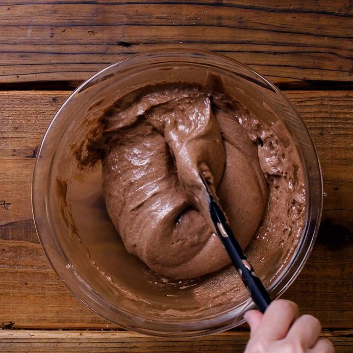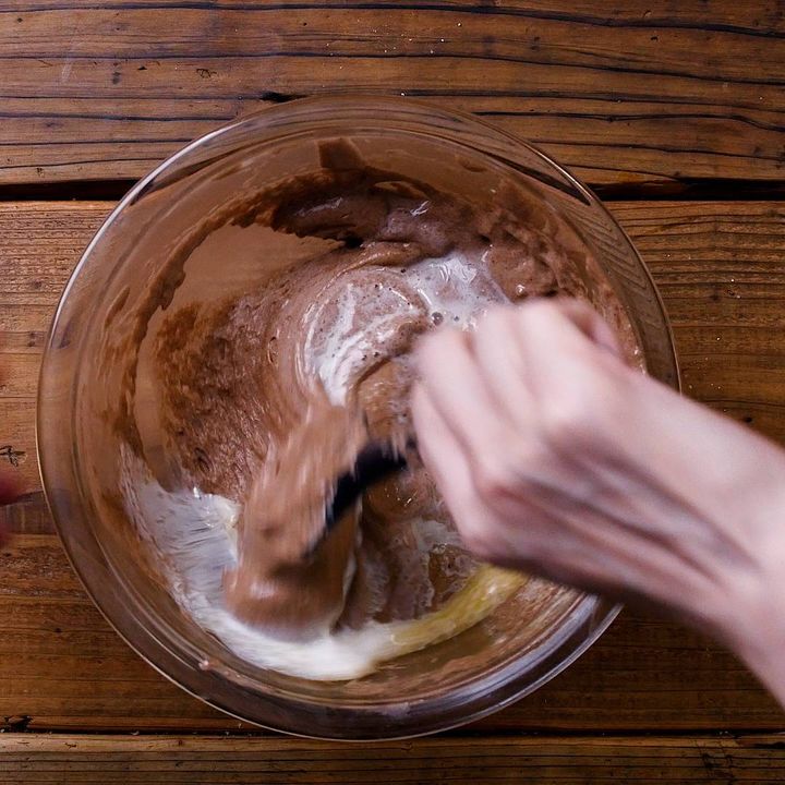 5: 薄力粉、ココアパウダーをふるい入れ、ゴムべらで底からすくいあげて返しながら練らないように混ぜます。