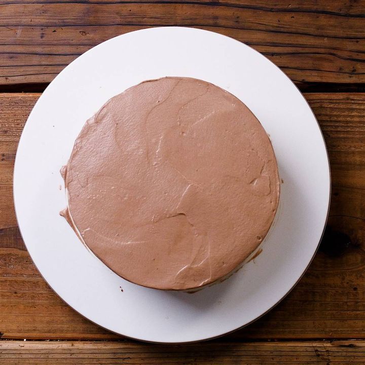 13: パレットと回転台を使い、均一に塗り、はみ出たクリームは側面に下すように塗り、最後に余分なクリームをすり切ります。お好みでクリームを絞り、削りチョコ、ラズベリー、ブルーベリーなどを飾って完成です。