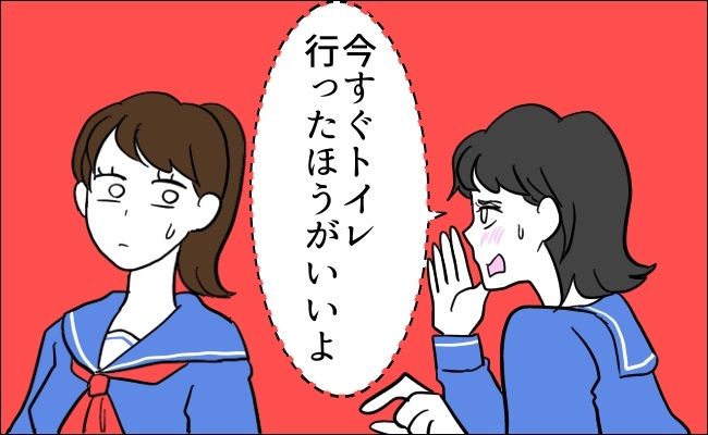 しかし教室へ戻る途中、「すぐトイレ行ったほうがいいよ」と、後ろの女子に囁かれたのです。私はすぐに察し、トイレへ行きました。