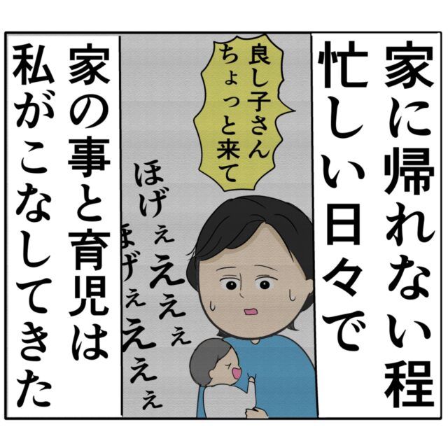 「家に帰れない程忙しい日々で、家の事と育児は私がこなしてきた」