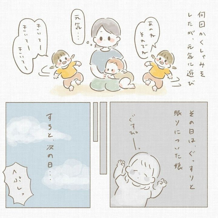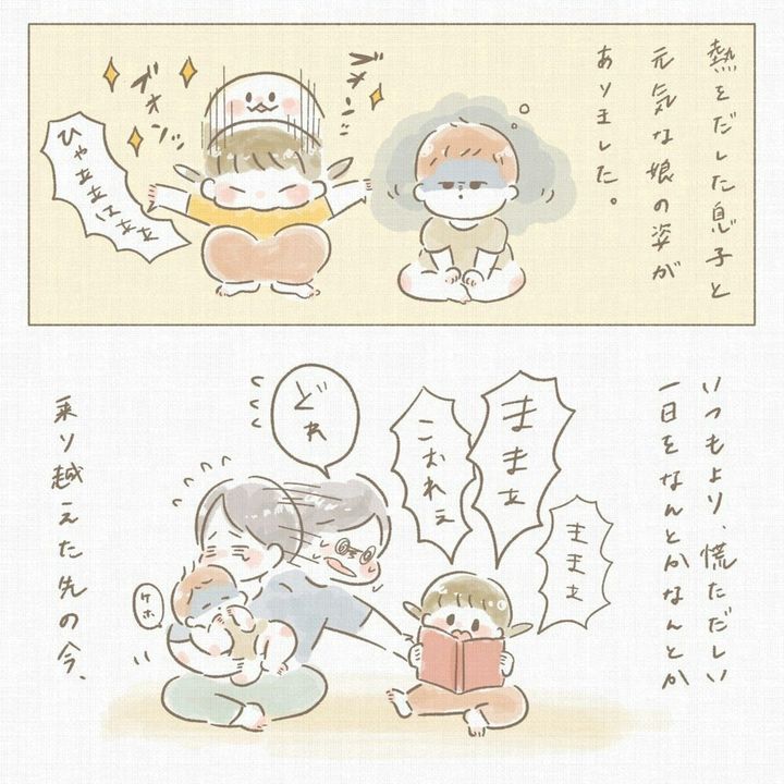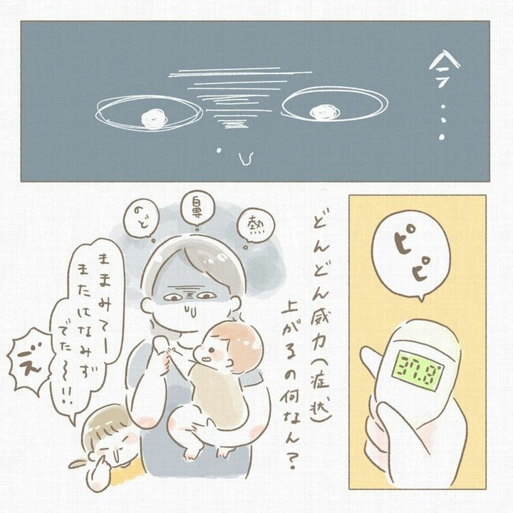 お姉ちゃんのくしゃみから始まり、翌日には弟が発熱してしまいました。体調不良の連鎖は、普段から忙しい日常がさらにあわただしくなりそう。