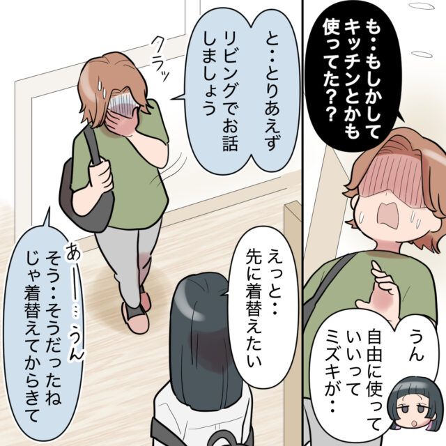 「『私持ってくるよ』って・・も、もしかしてキッチンとかも使ってた??」「うん、自由に使っていいってミズキが・・」エリカさんの言葉に青ざめつつ、「と・・とりあえず、リビングでお話しましょう」とお母さんが言うと、「えっと・・先に着替えたい」エリカさんの言葉に「あー・・うん、そう・・そうだったね。じゃ着替えてからきて」頭がクラクラするのを感じながらお母さんは言いました。