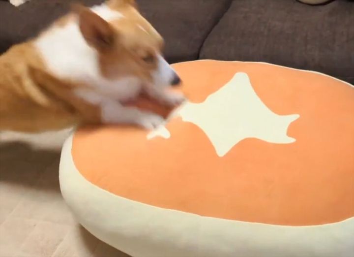 しかし、助走もないうえにその特徴的な短い脚もありほとんど跳べておらず、着地したのはクッションの端。
