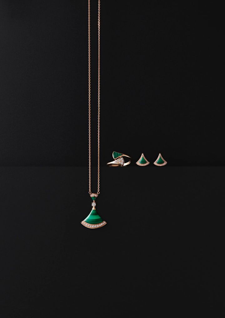 右から:「ディーヴァ ドリーム」ピアス¥504,900、同 リング ¥451,000、同 ネックレス¥907,500[全てPG×マラカイト×DIA](全てブルガリ/ブルガリ・ジャパン)