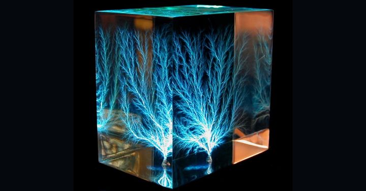 絶縁体である透明なアクリルボードやポリカーボネートなどに高電圧で傷をつけると、そこを起点に連鎖的に電子が飛んでアクリル内に傷を付け、放電の経路や分岐パターンが描かれます。