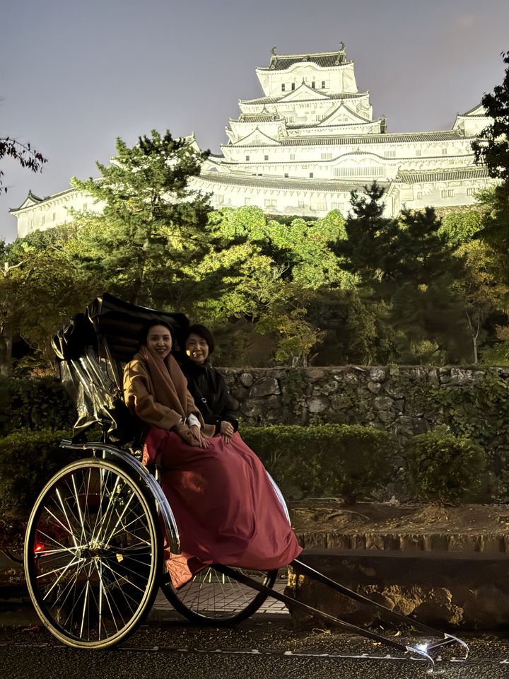 姫路城は正面から見るより、実は裏から見るのが美しいと伺い、記念に写真を一枚撮ってもらったのですが、ベストスポットを知り尽くしているからこそのアングル! 姫路城の歴史や周辺の情報を聞きながら一味違った視点でまわる人力車、乙なものですよ~。