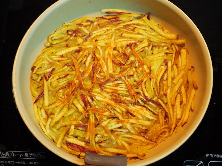 すでにこんがりおいしそう! 端までしっかりパリパリにするには、フライパンにさつまいもがぴったりつくように、たまに押し付けるようにして焼いていくと良さそうです。