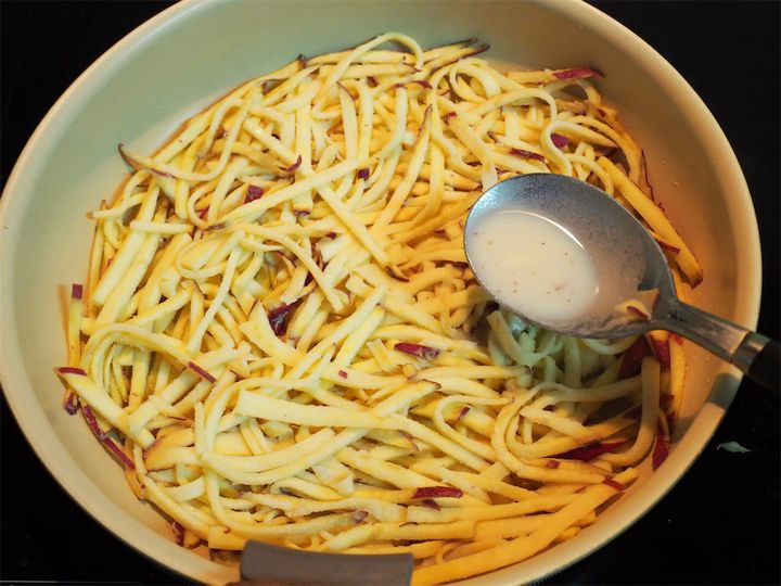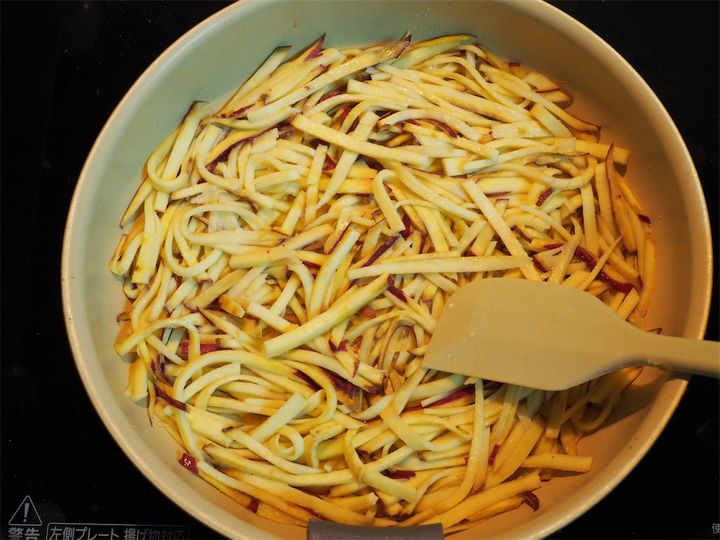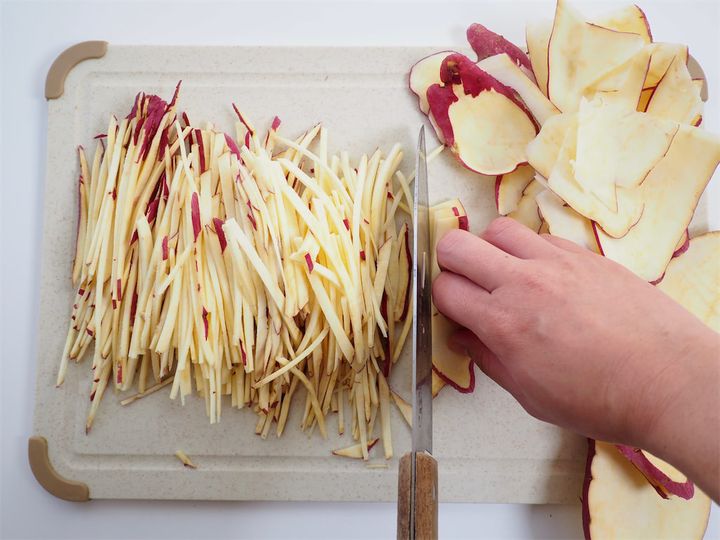 1. さつまいもをスライサーで薄切りにし、さらに細切りにしていく。