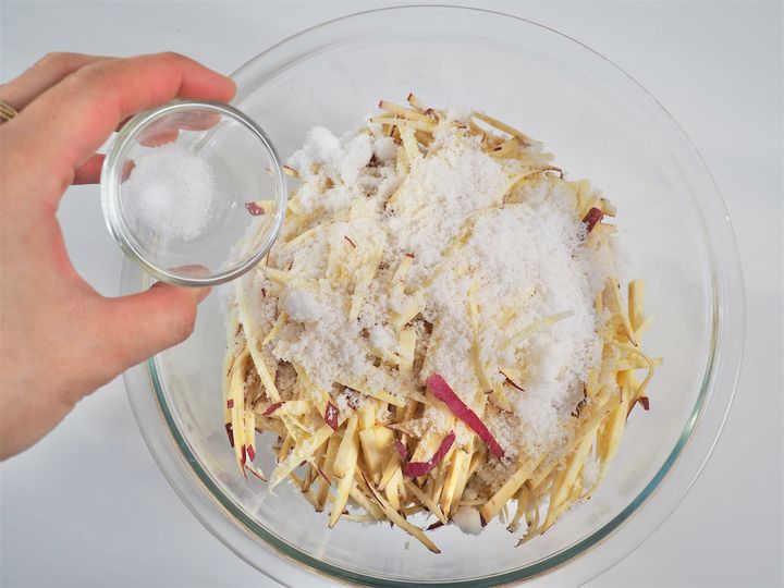 塩を入れることで、甘さが引き立つとのこと♪さつまいもの水分を引き出すとともに、柔らかく扱いやすくしていきます。5分だとあまり水分が出なかったので、追加で5分置いてみると、より水分を引き出すことが出来ました。