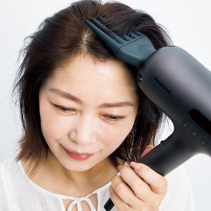 手ぐしの代わりになるブラシをつければ、根元の立ち上がりも簡単にスタイリングできます。
