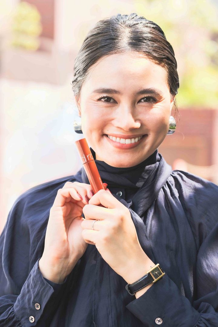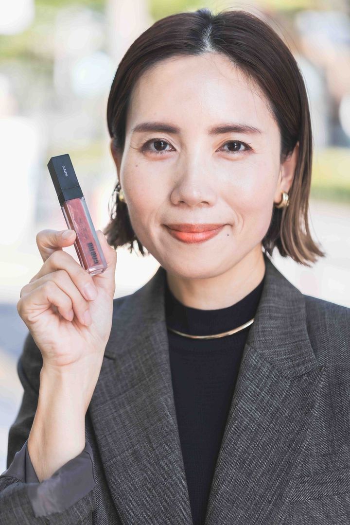 「以前、美容師さんにオレンジ系のメイクが似合うとアドバイスをもらったときに、ガブミーのリップをおすすめされ購入しました。02番はマットな質感なので、少量を取って軽く伸ばして仕上げています。落ち着いた色味ながら発色がよく、ジャケットの色とも合うので園行事によく付けています」安藤也恵さん(40歳・158センチ)