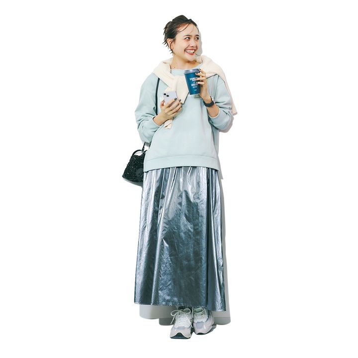 ロゴスウェット着回し ジップカーディガン¥7,997(フリークス ストア/フリークス ストア渋谷)シルバーフレアスカート¥17,600(ビューティー&ユース/ビューティー&ユース ユナイテッドアローズ 丸の内店)ソックス¥1,100(靴下屋/タビオ)バッグ¥46,200(ジャンニ キアリーニ/ユナイテッドアローズ 渋谷スクランブルスクエア店)スニーカー¥22,000(ニューバランス/ニューバランス ジャパンお客様相談室)時計¥29,150(G-SHOCK ANALOG-DIGITAL/カシオ計算機 お客様相談室)