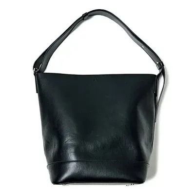 ソフトなレザーで折ってかかえても持てる。たっぷりの収納力と、丸みを帯びた台形フォルムが特徴。 レザーポーチつきブラックビッグバッグ(36×66×12)/アンドミューク(アマン)