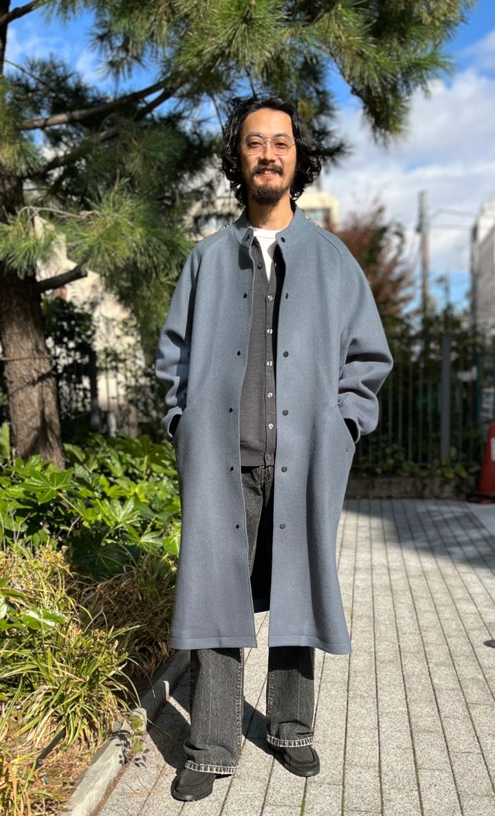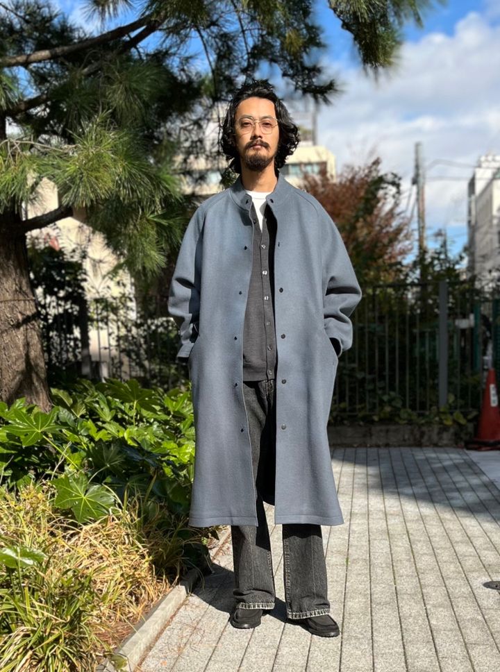 「グレーが入ったブルーのコートを主役に、そのほかのアイテムもグレーに絞ってスタイリングを構成しました。コートのデザインベースはミリタリーですが、たっぷりとしたサイズ感や無駄な装飾を省くことでモダンに昇華させたところが気に入っています」と桂さん。