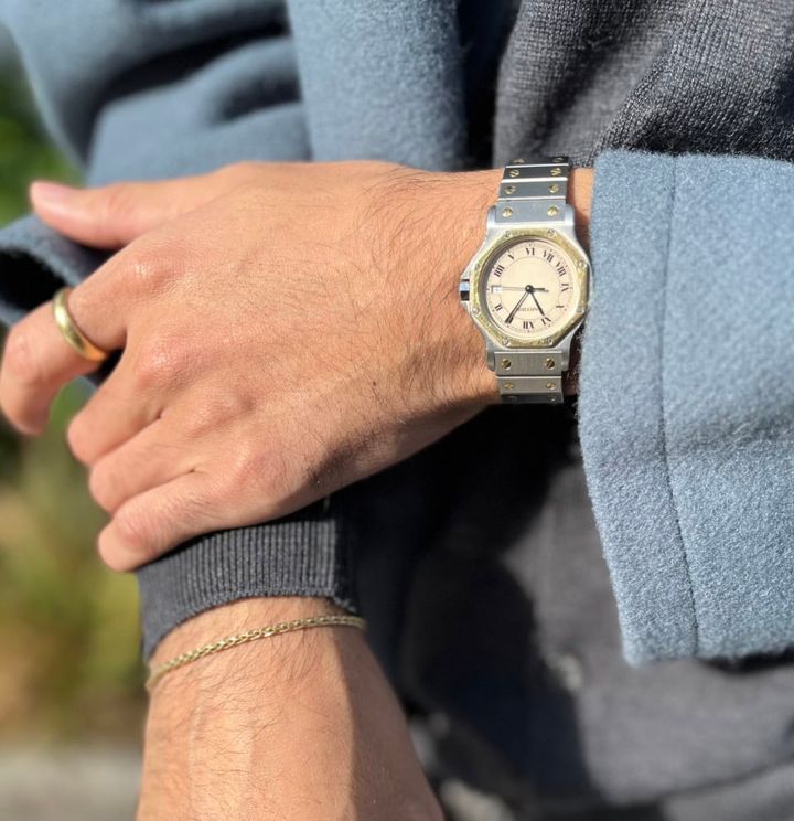 カルティエのサントスは、10年間しか作られなかったオクタゴンのボーイズサイズをセレクト。ブレスレットとリングはティファニーのヴィンテージ。カジュアルコーデの大人っぽいアクセントに