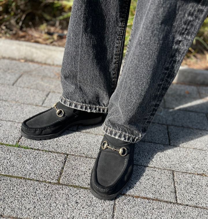 シューズはラバーソールで適度にボリュームがあるため、品のあるデザインでもカジュアルコーデと好マッチ