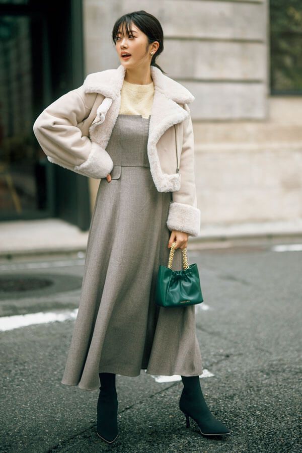 ムートンジャケットをすっきり着たい!美シルエな「キャミワンピ」で縦のラインを強調!