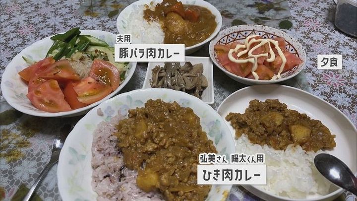 陽太くんと弘美さんはひき肉のカレー、弘美さんの夫は豚バラ肉を入れています。