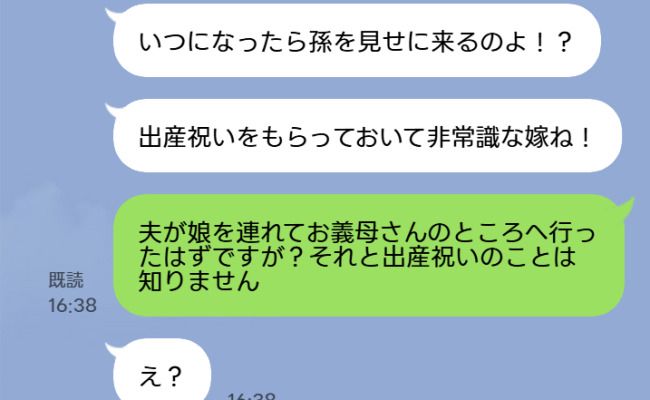 「夫が娘を連れてお義母さんのところへ行ったはずですが?それと出産祝いのことは知りません」