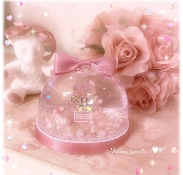 ピンクをメインカラーに使用した、ガーリーなスノードーム作品です!こちらは、中に小さな香水の瓶やパールなどを飾ってあり、華やかなので大人の女性のインテリアとしてもピッタリ♡容器の上には、リボンの装飾をしているオリジナル感も素敵ですね!