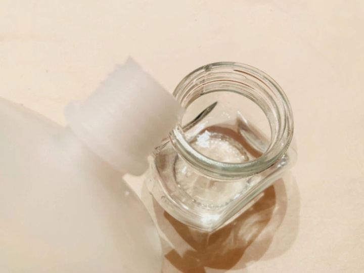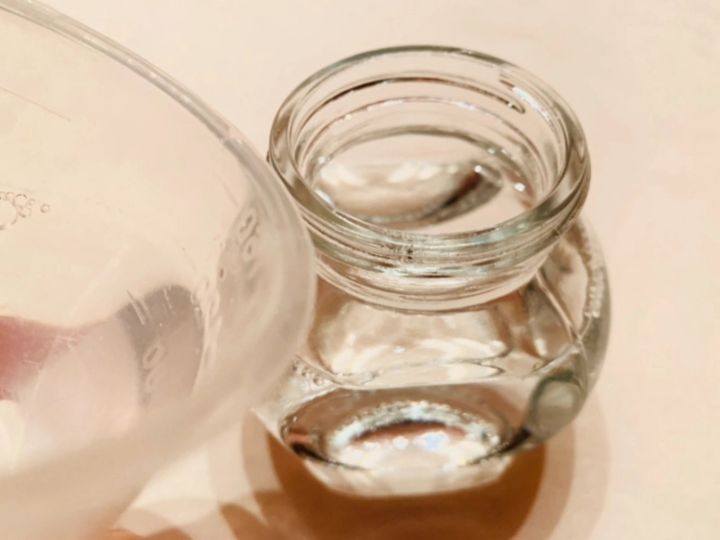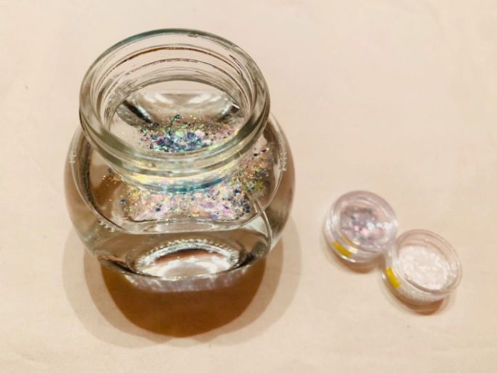 続けて、水も入れていきます。配合は、“のり7:水3”がベースです。のりの量で、ビンの中のグリッターやクラッシュホロの舞い方が変わっていくので、配合を調整しながら楽しむのがおすすめです。