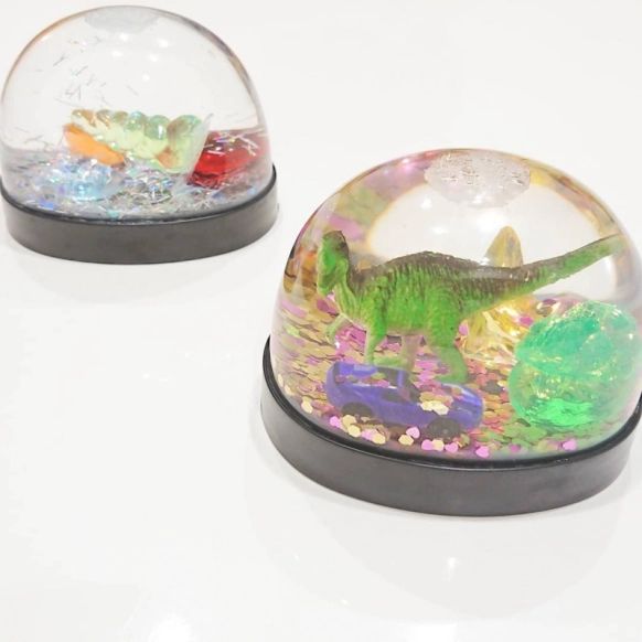 旅行先で息子さんたちが作ったという、ユニークなスノードームに注目です。作成後24時間は逆さにして乾かし、家に帰宅してから水を入れて蓋をして完成させたそう!左側の作品は、中にクリアな貝などで飾られて、夏にピッタリで涼し気な雰囲気。右側の作品は、恐竜や車など、わくわくするモチーフで面白いですね◎