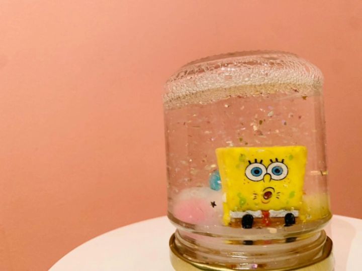 家にあった空き瓶と、100均の材料のみで作られたこちらのスノードーム!スポンジボブは、グルーガンで接着しているそう。中身は、洗濯のり×水に、デコレーションボール・クラッシュホロ・星形のキラキラなど、複数の材料で仕上げてPOPでかわいいですね♡