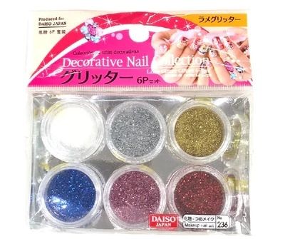 100均のネイルコーナーでは、装飾アイテムが充実!ダイソーの「グリッター6Pセット ラメグリッター」110円(税込)は、さまざまなカラーでスノードームにキラキラ感をプラスできます。
