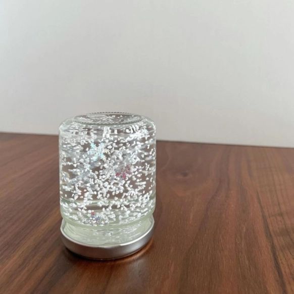 あえて特別なオーナメントを使用せず、雪が舞うような演出をしたシンプルなスノードームも素敵ですよ☆こちらは、ジャムの空き瓶とスノーパウダー以外は、すべて100均のアイテムなんだそう。水と洗濯のりに、ネイルのラメなどを追加して作られています。