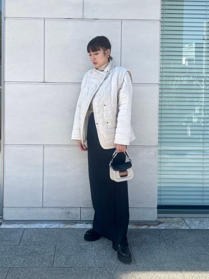 「冬に映える白のもこもこアウターをメインにコーディネート。中綿入りのボリュームアウターなので、ボトムにはスッキリとしたIラインのスカートと同系色のブーツを合わせました。チェーン付きのマルチカラーバッグをアクセントに。スカートがハイウエストなので上半身にボリュームがあってもスタイルアップでき、スリットが入っているのでヌケ感も◎」