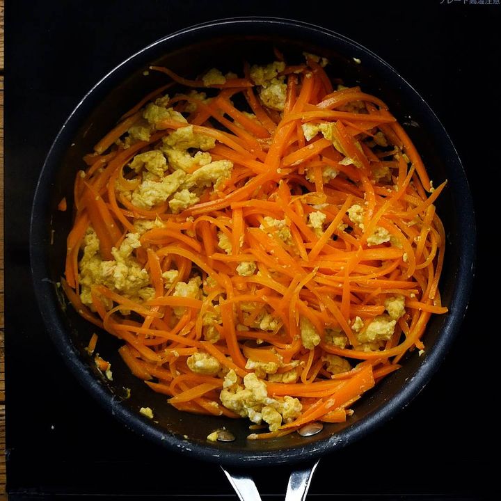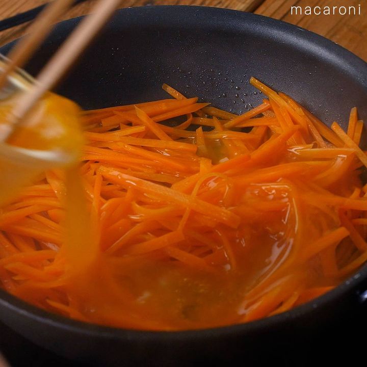 4: にんじんから水分が出て少ししんなりとしたら、②を加えて炒めます。