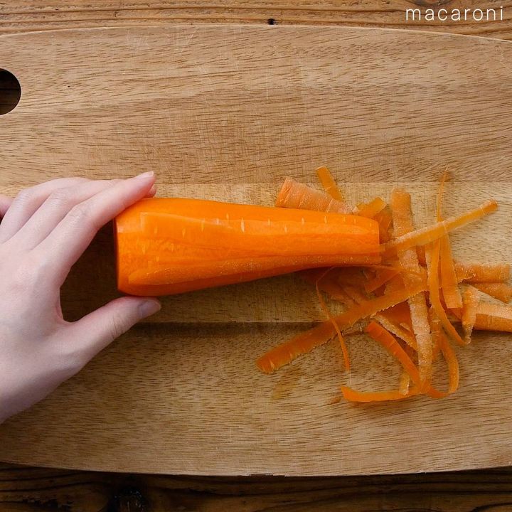 1: にんじんのヘタを落として皮をむきます。斜め薄切りにしてから、細切りにします。