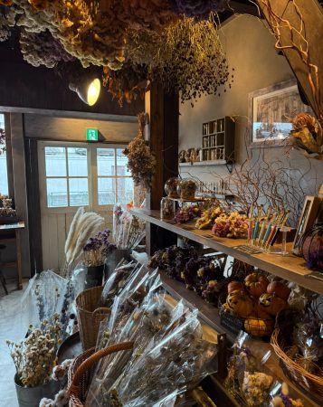店内は、色とりどりのドライフラワーが飾られ、アンティーク調の家具が温かみのある雰囲気を作り出しています。