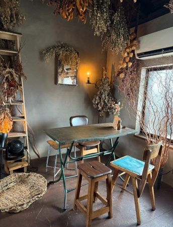 ドライフラワーに囲まれた静かな空間が広がる、ひとときの癒しを提供してくれるカフェです。