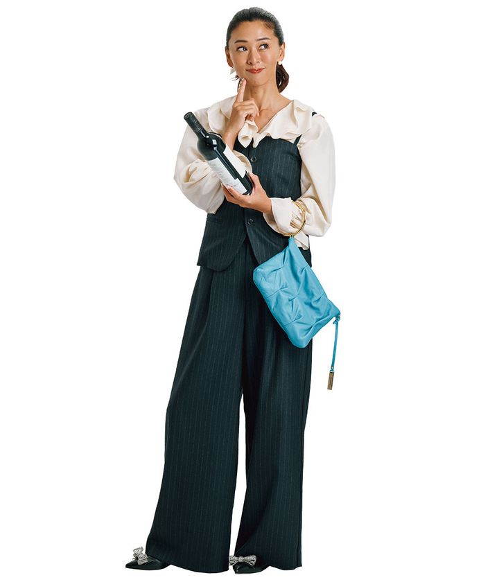ビスチェ¥34,100、パンツ¥36,300(ともにプルミエ アロンディスモン)フリルブラウス¥26,400(プルミエ アロンディスモン)バッグ¥45,100(レ ミネ/ティースクエア プレスルーム)パンプス¥41,800(PIPPICHIC/ベイジュ)ピアス¥66,000(カラットアー/イセタンサローネ東京)