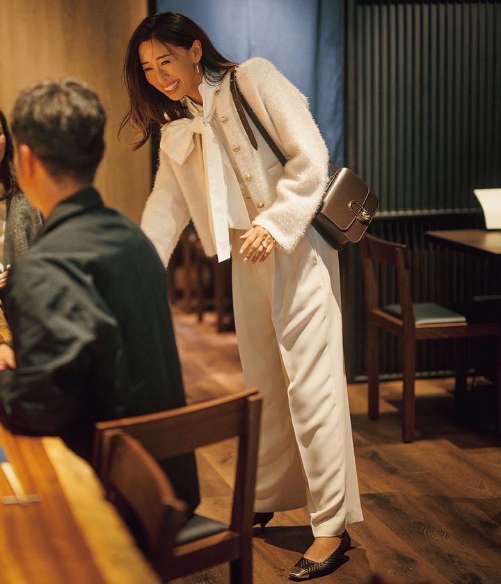 ジャケット¥59,400(プルミエ アロンディスモン)ニット¥35,200(ウィム ガゼット/ウィム ガゼット 青山店)タックパンツ¥19,910(アンクレイヴ スタンダード/オンワード樫山)バッグ¥38,500(メアリ オル ターナ/AL Design Inc.)パンプス¥35,200(ツル バイ マリコ オイカワ)カチューシャ¥22,000(アレクサンドル ドゥ パリ/アレクサンドル ドゥ パリ GINZA SIX店)ピアス¥93,500(マリハ)チョーカー¥44,000(ブランイリス/ブランイリス トーキョー)リング[右手]¥59,400(アナプノエ/フォーティーン ショールーム)