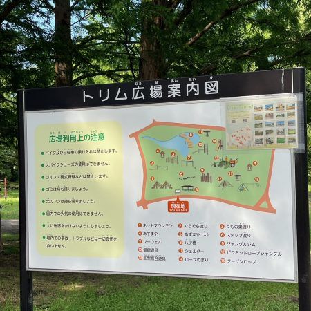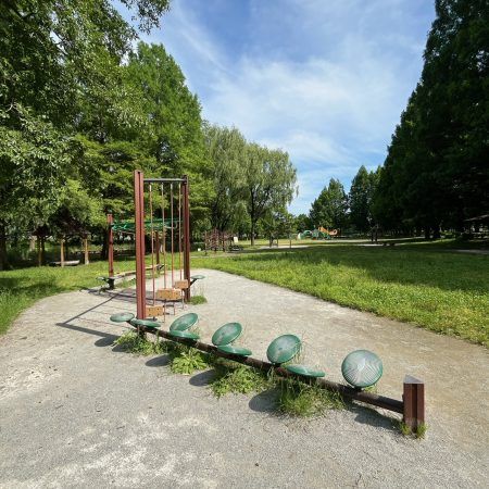 広々とした広場にはジャングルジムやターザンロープ、健康遊具などあります。