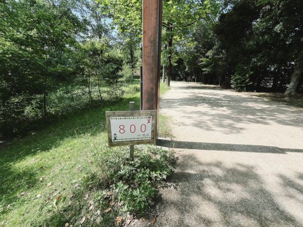 散歩道はジョギングコースでもあり、目安の看板がありました(私がジョギングしていた若いころにはなかったです)。