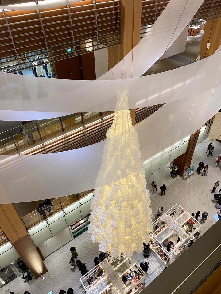 ガレリア館内に浮いているのは、真っ白なクリスマスツリーです。各階で見え方が違うで、ぜひ優しく雪が降り積もったようなふんわりあたたかなツリーをいろんな角度から見てみてください。
