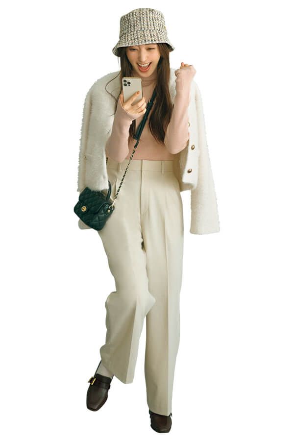 ニットジャケット¥25,300/ジャスグリッティー ニット¥9,350/Noëla パンツ¥3,990/UNIQLO ハット¥9,790/CA4LA(CA4LA プレスルーム) バッグ¥14,300/ダイアナ(ダイアナ 銀座本店) ソックス¥770/ドット フクスケ(福助) パンプス¥7,700/オリエンタルトラフィック(ダブルエー)