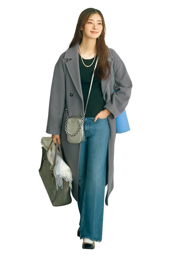 コート¥29,920/PROPORTION BODY DRESSING ニット[カーディガンとセット]¥22,000/ジャスグリッティー デニムパンツ(VI S別注)¥10,890/CIMARRON ×VIS(VIS) ネックレス¥9,720/アビステ ストール¥4,950/MISCH MASCH ショルダーバッグ¥35,200/ケイト•スペード ニューヨーク(ケイト•スペード カスタマーサービス) トートバッグ¥68,200/ジャンニ キアリーニ(ジャンニ キアリーニ 銀座店) ソックス¥770/ドット フクスケ(福助) 靴¥24,200/卑弥呼