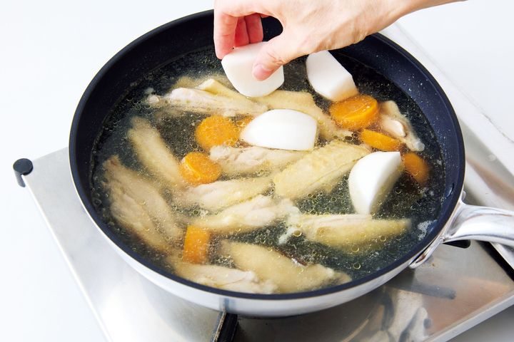 フライパンに昆布と鶏肉、にんじん、水4カップを入れて中火にかける。煮立ったらアクを取り、ふたをして7~8分煮る。かぶを加え、再びふたをして6~7分煮る。味をみて塩、こしょう各適宜でととのえる。