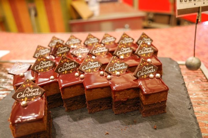 出典:MORE「チョコレートとラズベリーのケーキ」 濃厚なチョコレートとラズベリーの酸味が絶妙な大人なケーキ。クリスマスのチョコプレートが一切れずつ載っているのも嬉しい♡