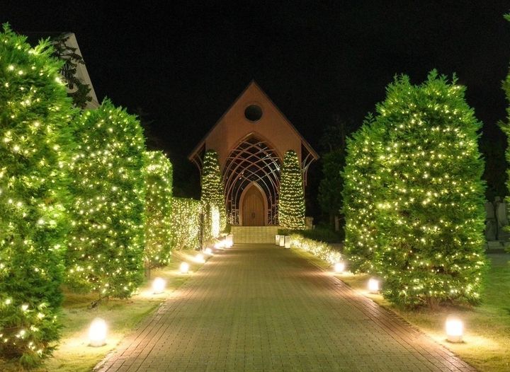 ガーデンのチャペルもライトアップされ、幻想的な冬の夜を彩ります。