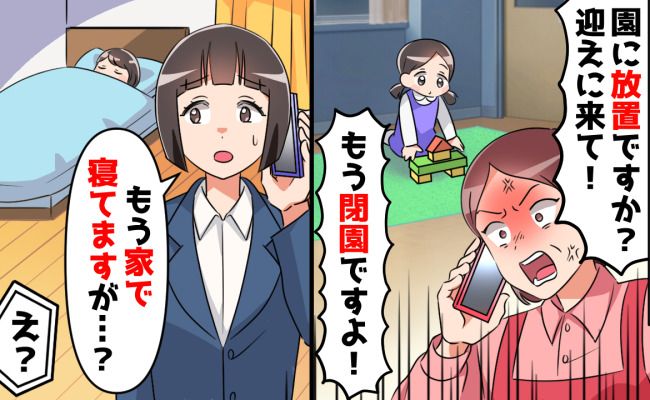 数日後の夜、家事や寝かしつけを終えて私がスマホを見ると、保育園から着信がありました。新人のA先生からの電話で、「お子さんは園に放置ですか! もう閉園ですよ!」と怒りの電話。