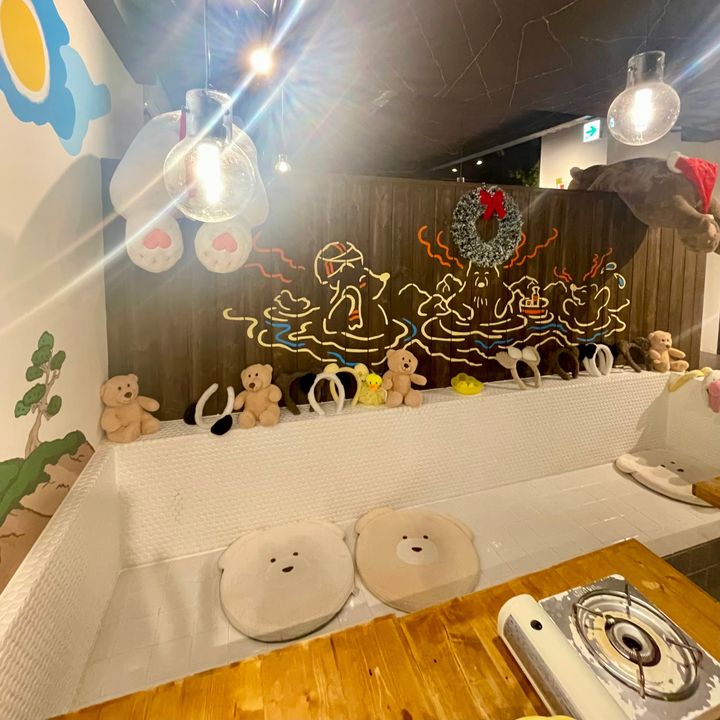 店内に入ると、温泉をイメージした雰囲気に、くまのぬいぐるみや座布団など可愛く飾られていて、早速テンションがあがります