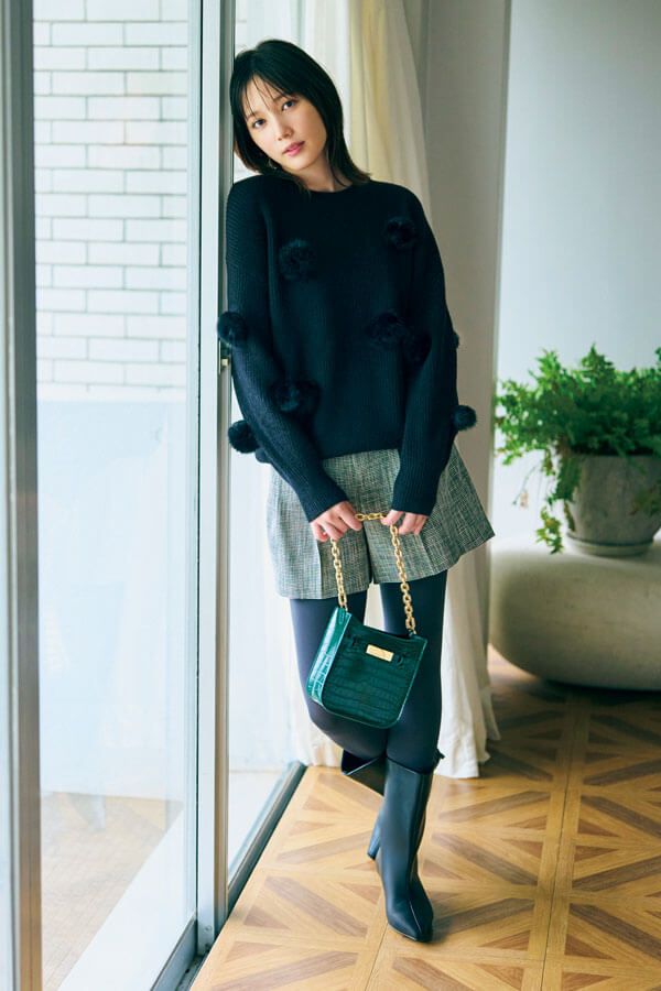 上半身にボリュームが出るモチーフニットは、ショーパンできゅっとコンパクトにまとめるとバランス◎。タイツ×ブーツでバランスを取れば、ヘルシー&リッチな冬のショーパンルックが完成。ぽんぽんモチーフの遊び心に、チェーンバッグでパンチをひとさじ。