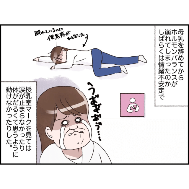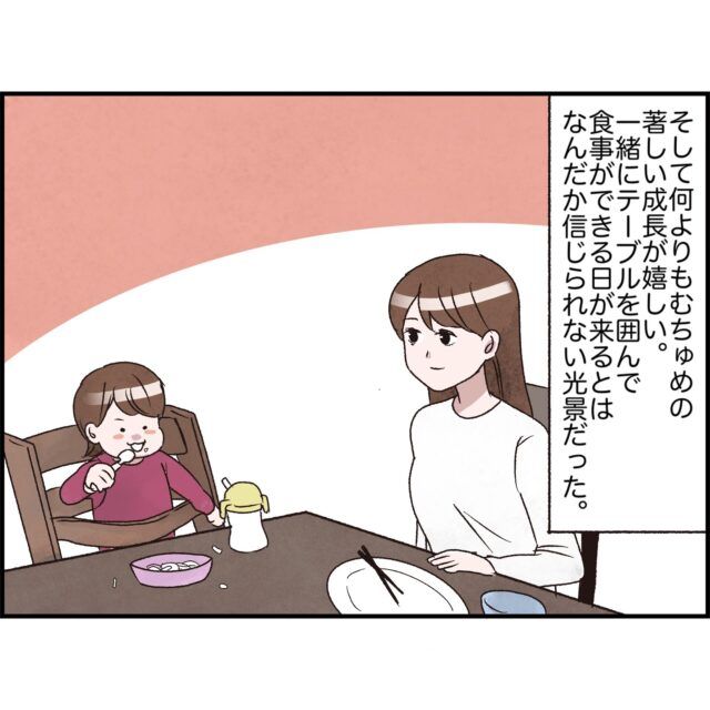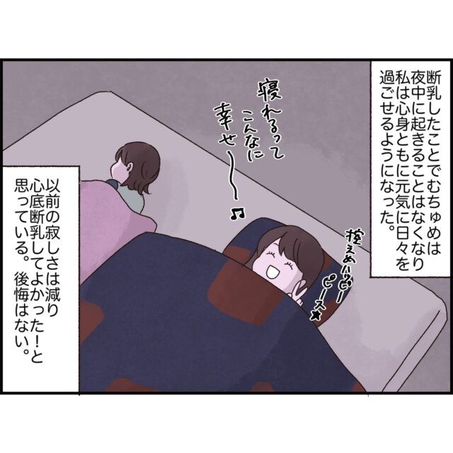 卒乳が理想だったものの、最終的には断乳を決意したしおさん。断乳6日目に突然またおっぱいを欲しがった娘ちゃんの求めを涙ながらに断ったしおさんは、その夜、娘ちゃんの寝顔を見ながら「もう最後だと本人もわかっている気がする」と感じました。そして、夜中の授乳で眠れず辛かったことや離乳食を全然食べてくれず悩んだことなどを思い返し涙しながら眠りにつきました。