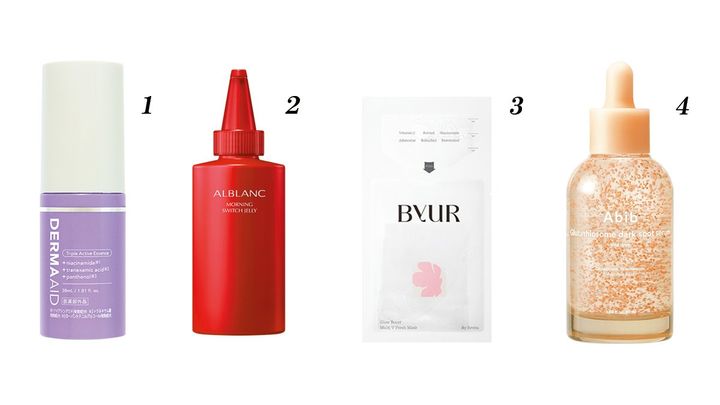 1.ダーマエイド トリプルアクティブエッセンス(医薬部外品) 30㎖ ¥2,420/pdc 2.アルブラン モーニング スイッチジュレ 90g ¥4,950/花王 3.バイユア グローブースト マルチV フレッシュマスク 1枚入り ¥440/Hamee 4.Abib グルタチオンソームセラム 50㎖ ¥3,180